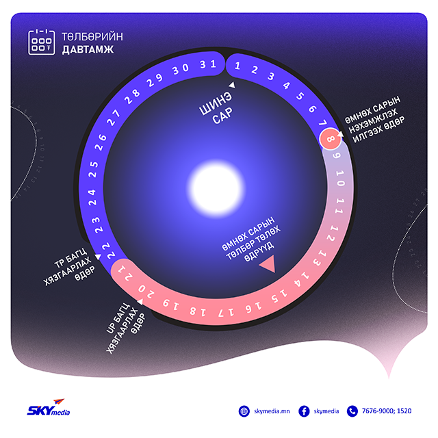 Түүнчлэн таны өмнөх сарын хэрэглээний төлбөр дараа сарын 8-нд бодогдож төлбөрийн мэдээлэл илгээгдэх бөгөөд та энэ өдрөөс эхлэн 21-нийг дуустал төлбөрөө төлөх боломжтой байдаг байна.