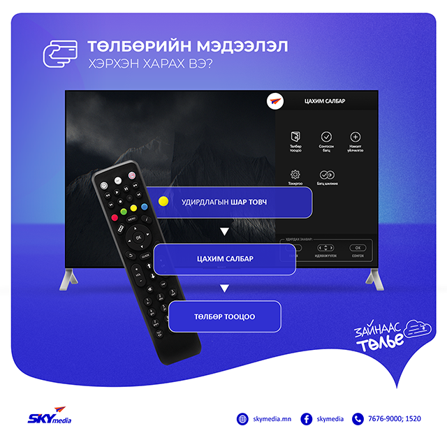 СКАЙмедиа үйлчилгээний хэрэглэгч та төлбөрийн нэхэмжлэх, задаргаа, видео сангийн хэрэглээ зэрэг мэдээллүүдийг гэрээсээ гаралгүйгээр хялбархан авах боломжтой гэдгээ мэдэх үү?