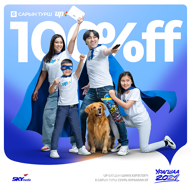 Та СКАЙмедиа үйлчилгээний, тэр дундаа бүхнийг багтаасан UP багцын шинэ хэрэглэгч болоод 6 сарын турш үйлчилгээний суурь хураамжаасаа 100% чөлөөлөгдөөрэй.