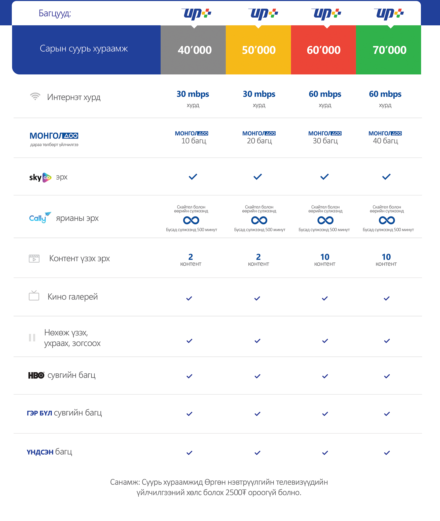 Мөн СКАЙмедиа үйлчилгээний одоогийн хэрэглэгч та UP багц руу шилжсэнээр тухайн сарын суурь хураамжаасаа 100% чөлөөлөгдөх боломжтой.