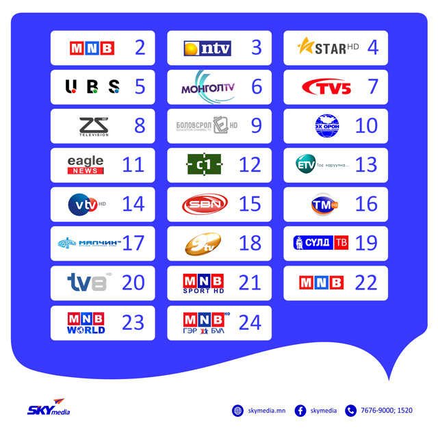 Иймд “СКАЙмедиа корпораци” ХХК нь тус хуулийн 20 дугаар зүйлийн 20.6, 26 дугаар зүйлийн 26.5, 26.7-д тус тус заасны дагуу 2021 оны 3-р сарын 01-ний өдрөөс нийтийн эрх зүйн хуулийн этгээд болох Монголын Телевизүүдийн Холбоонд гишүүнчлэлтэй 18 өргөн нэвтрүүлгийн телевиз болон Монголын үндэсний олон нийтийн 5 телевизийн дугаарлалтыг шинэчлэн 2-оос 38 хүртэлх сувгийн дугаарлалтад өөрчлөлт оруулж байгаа болно.
