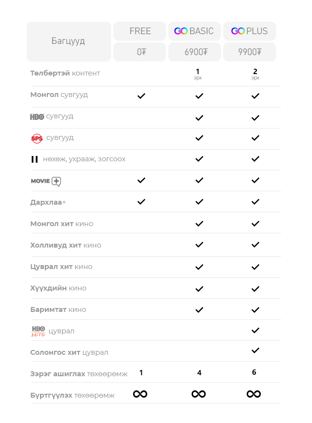 Та GO Basic, GO Plus багцуудаас өөрийн хэрэглээндээ нийцүүлэн сонголтоо хийгээрэй.
