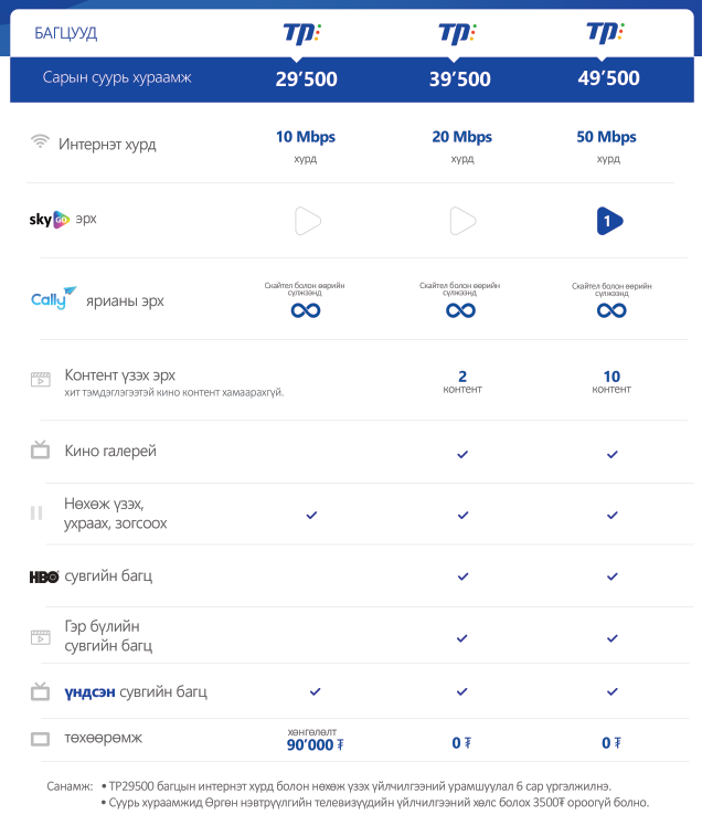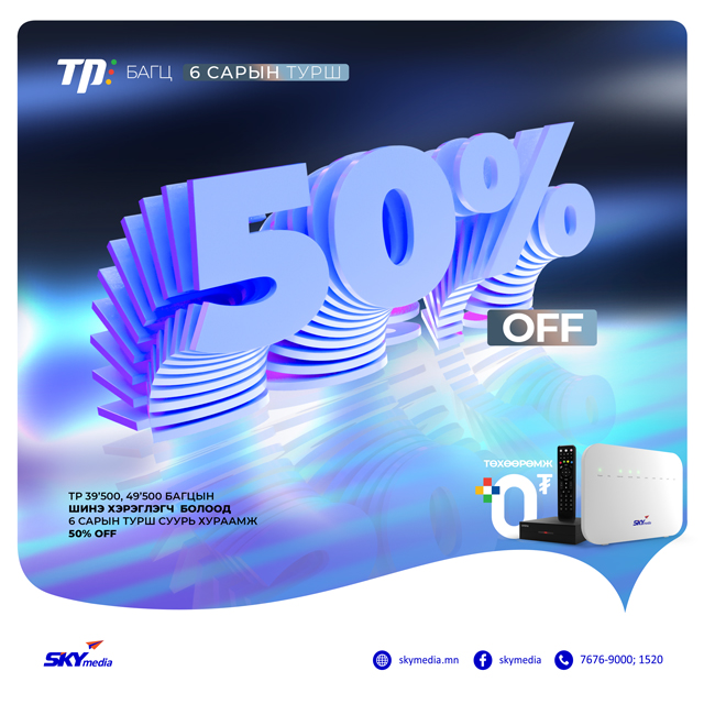 Та СКАЙмедиа гуравласан үйлчилгээний TP39500 болон TP49500 багцын шинэ хэрэглэгч болоод 6 сарын турш үйлчилгээний суурь хураамжаасаа 50% чөлөөлөгдөөрэй.