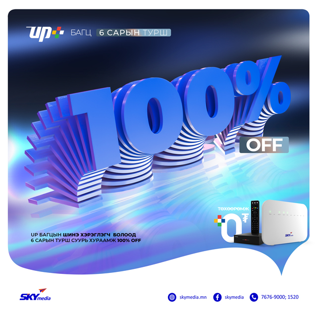 Харин СКАЙмедиа үйлчилгээний бүхнийг багтаасан UP багцын шинэ хэрэглэгч болсноор 6 сарын турш үйлчилгээний суурь хураамжаасаа 100% чөлөөлөгдөх боломжтой.