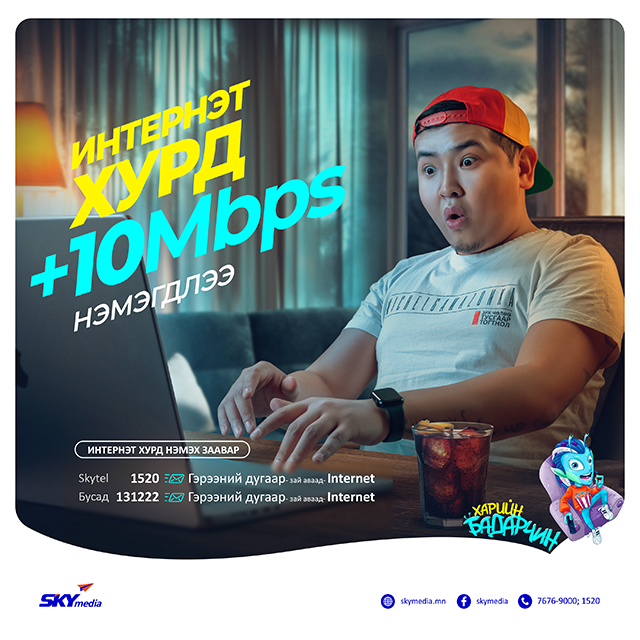 TP багцын интернэт хурд нэмэгдэж байгаа бөгөөд та www.skytel.mn вебсайт, Skytel аппликэйшнээр болон мессеж илгээгээд хурдаа 10Mbps-p нэмэх боломжтой.