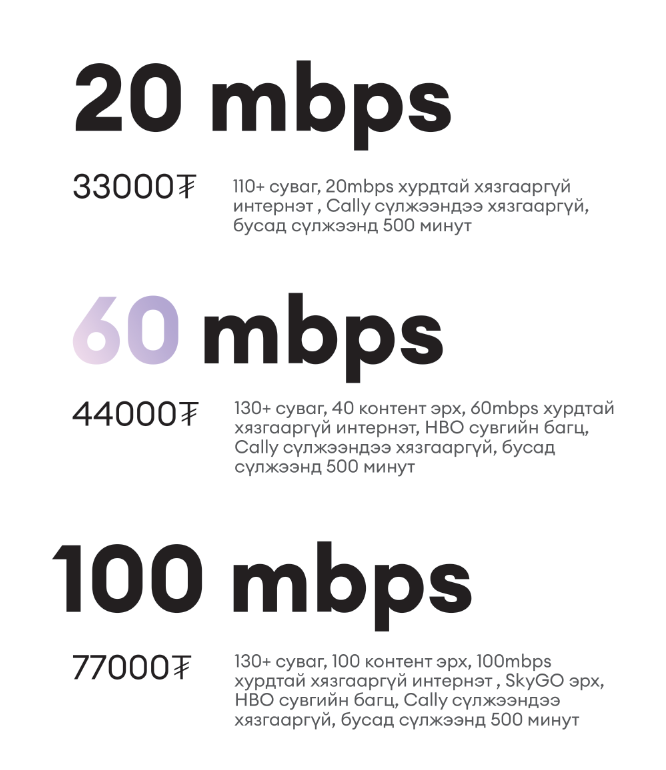 Хэрэглэгч бүрийнхээ хүсэлд нийцүүлэн нэвтрүүлсэн гуравласан үйлчилгээний X20, X60, X100 багцууд нь таны гэр бүлийн гишүүн бүрийг гэртээ онлайн байж хүссэн бүхнээ хийхэд туслах болно. Та яг одоо шилжээд хурдны шинэчлэлт, зуу зуун кино ертөнцийг мэдрээрэй.
