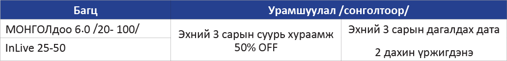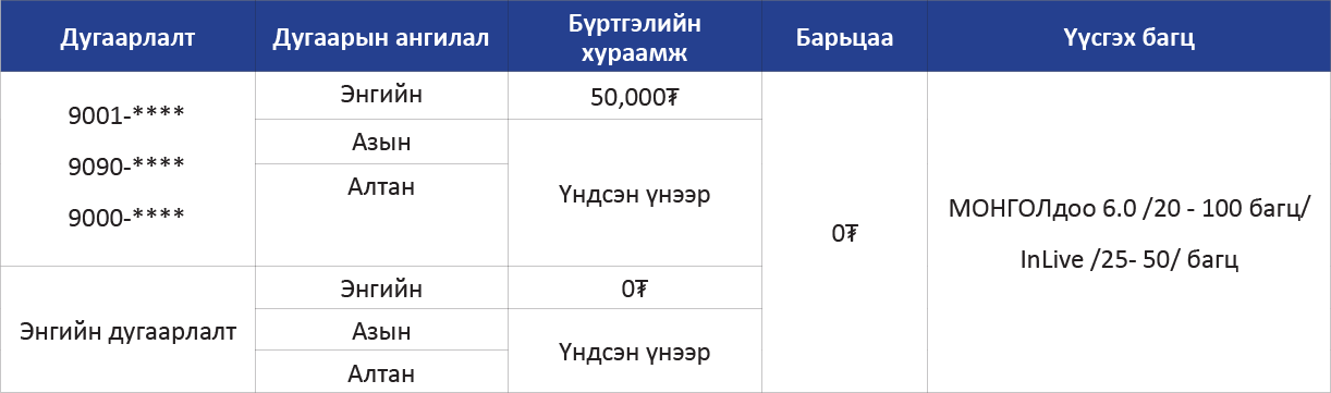 Дараа төлбөрт МОНГОЛдоо 6.0 болон InLive үйлчилгээнээс хүссэн багцаа сонгоод шинэ дугаараа бүртгэлийн хураамж, барьцаа төлбөргүй аваарай.