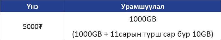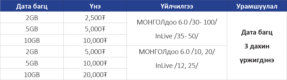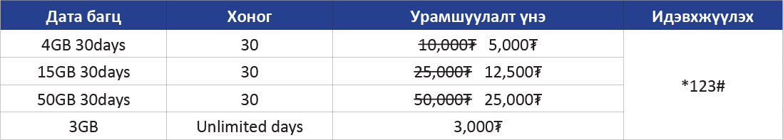 Мягмар гариг бүр 24 цаг хязгааргүй ашиглах дата багцаа 2000₮-өөр идэвхжүүлээрэй.