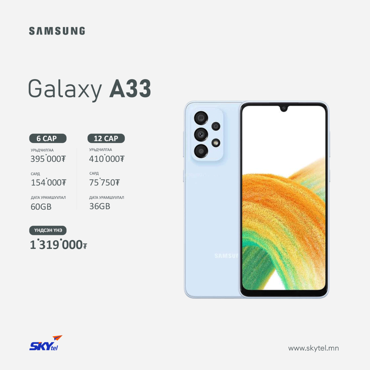 SAMSUNG Galaxy A33 гар утасны талаар дэлгэрэнгүй мэдээллийг энд дарж авна уу.