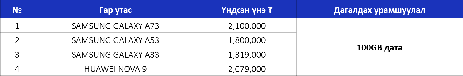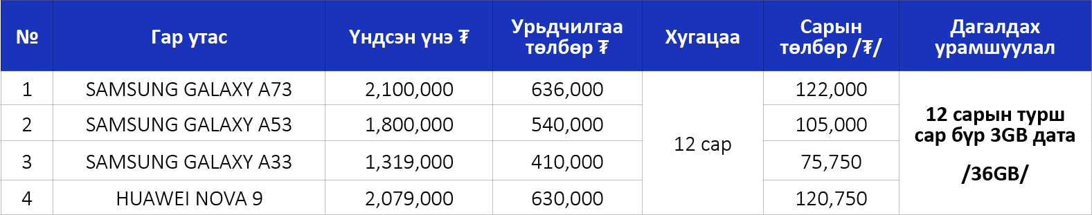 Технологийн салбарт манлайлагч SAMSUNG брэндийн A series болон HUAWEI nova 9 гар утаснуудыг урамшуулалтай үнээр болон лизингийн уян хатан нөхцөлөөр өөрийн болгоорой.