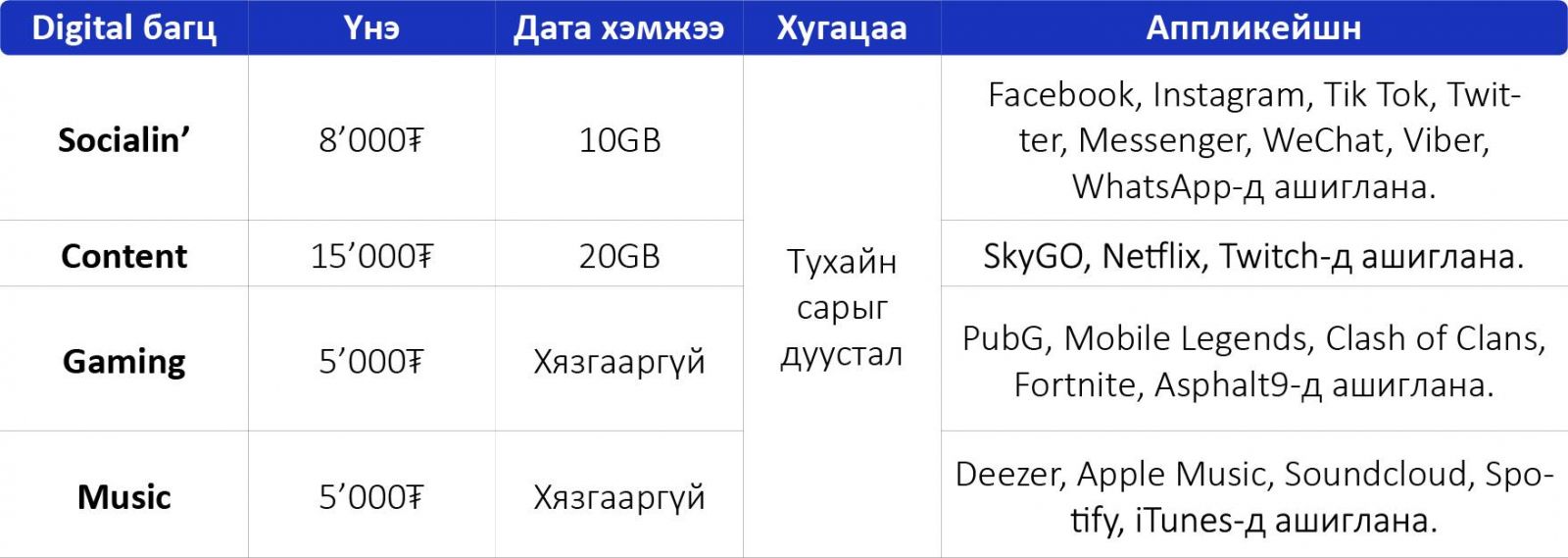 - DIGITAL багцаас өөрийн хэрэглээ, сонирхолд тааруулан сонгох боломжтой бөгөөд дөрвөн төрлийн багцаа зэрэг идэвхжүүлж болно.