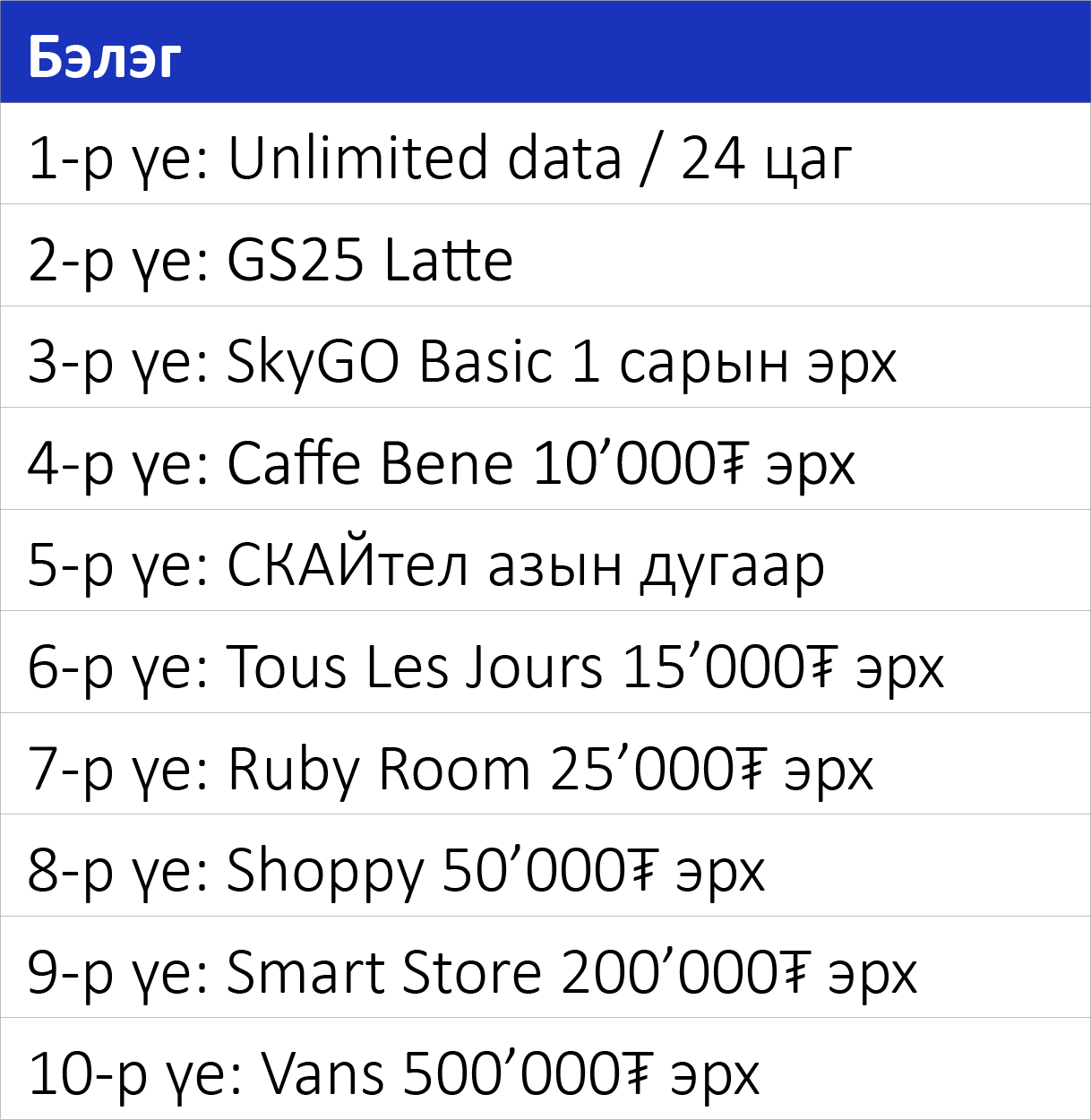 Тоглоомын үе тус бүрд дараах бэлгүүд хүлээж байна.