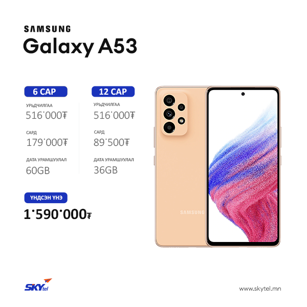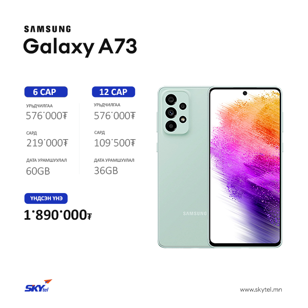 PocketZero болон Storepay ашиглан Samsung A33, A53, A73 утаснуудыг 4-6 хуваан төлөх нөхцөлтэйгөөр худалдаж аваад 100GB дата бэлэг аваарай.