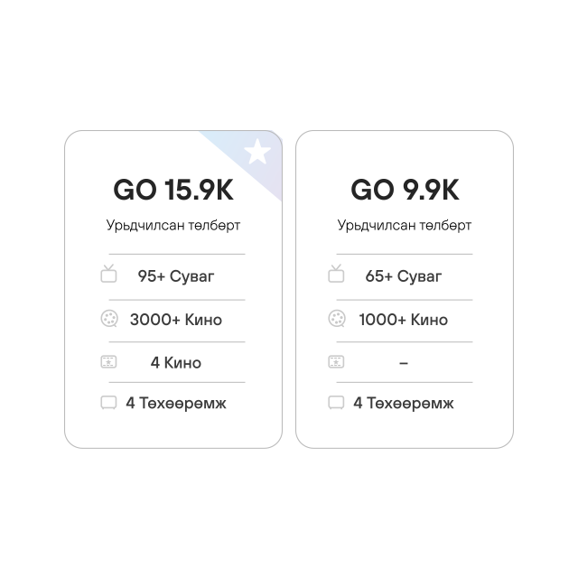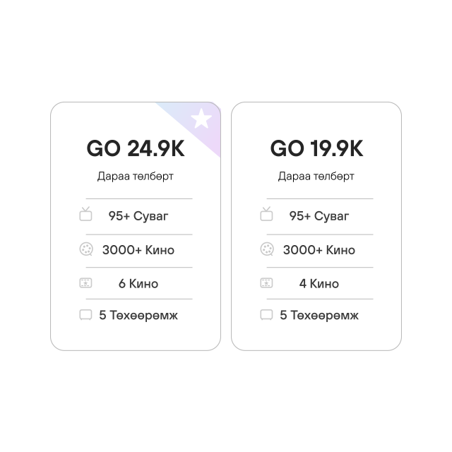 Та GO 9.9K, GO 15.9K, GO 19.9K, GO 24.9K багцаас сонгон интернетээр дамжуулан багцад дагалдах гадаад болон дотоодын 90 гаруй телевизийн суваг, 3000 гаруй кино контентыг хүссэн дэлгэцээрээ, хязгааргүй үзээрэй.