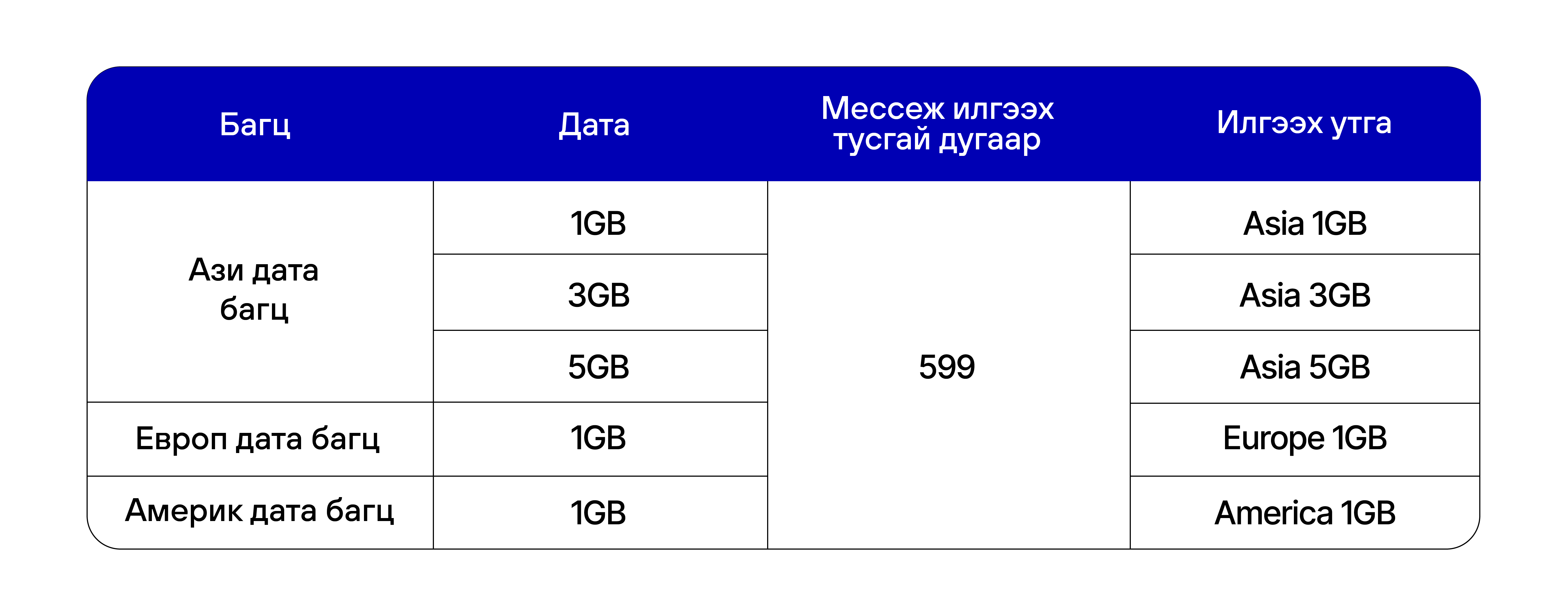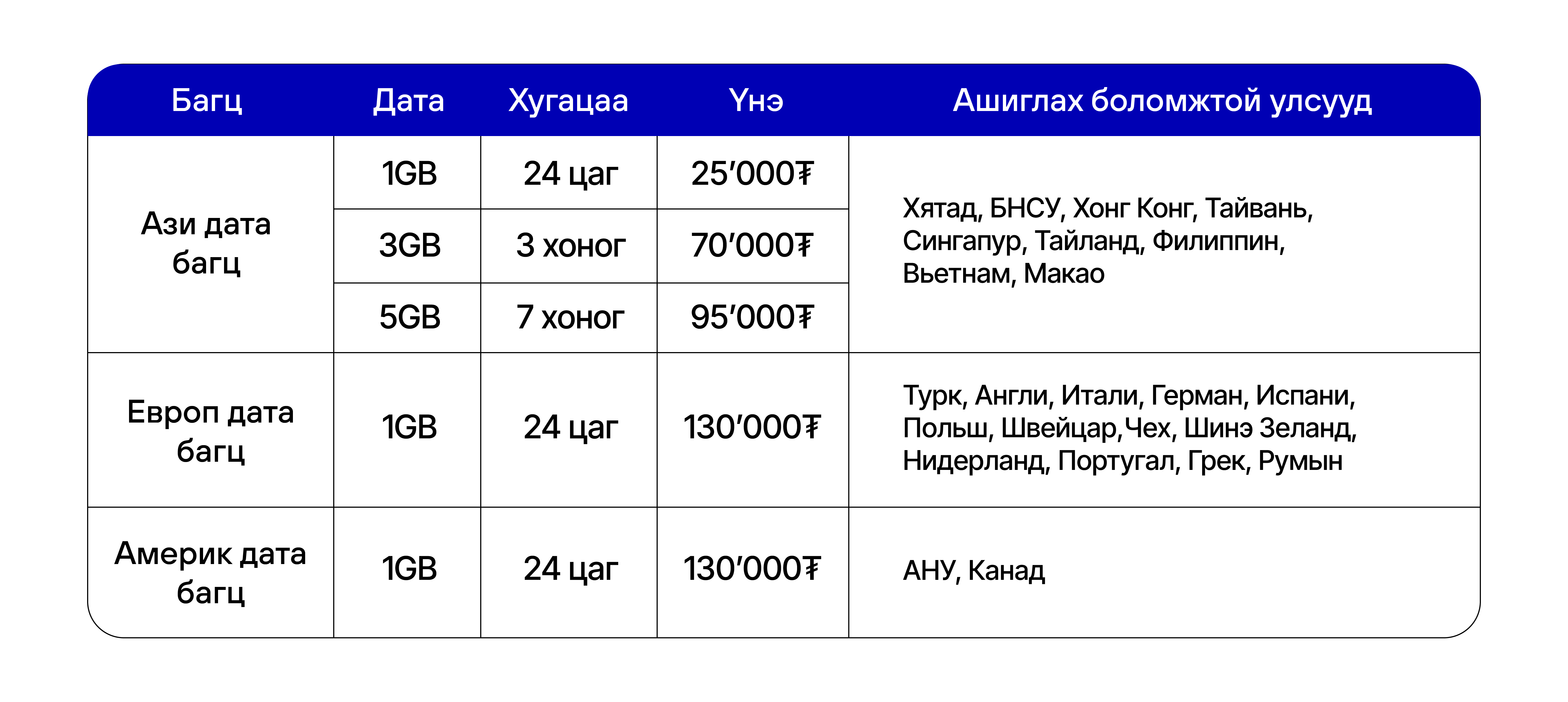 Санамж: Роуминг дата багцууд нь зөвхөн хамаарах улсуудад ашиглах боломжтой.