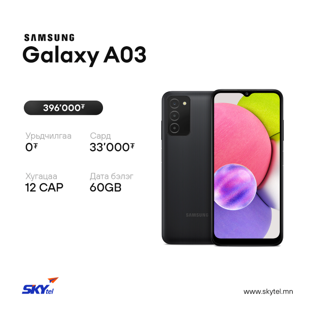 Мөн та PocketZero болон Storepay ашиглан Samsung A03, A13, A33, A53, A73 утаснуудыг 4-6 хуваан төлөх нөхцөлтэйгөөр худалдаж аваад 100GB дата бэлгэнд аваарай.