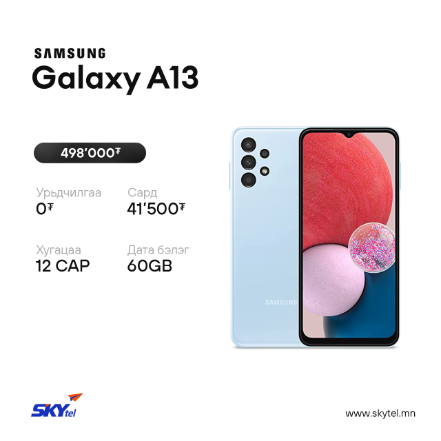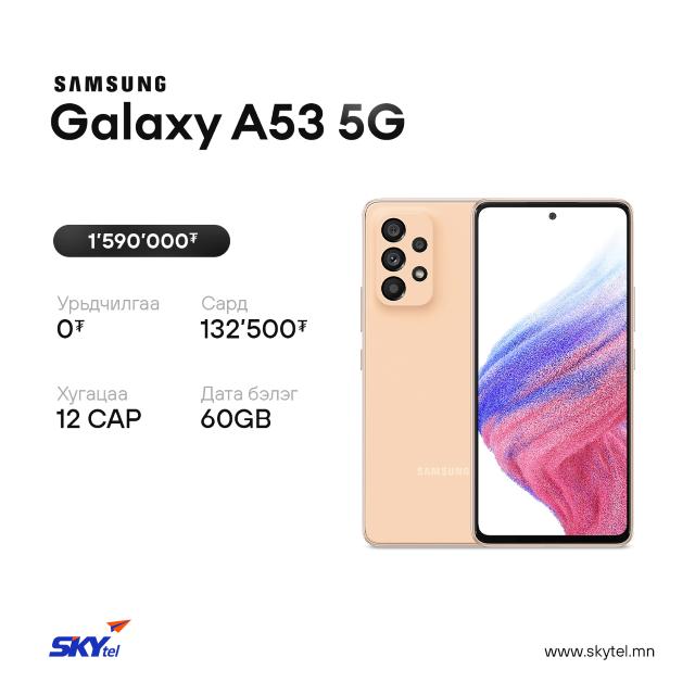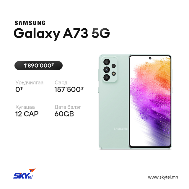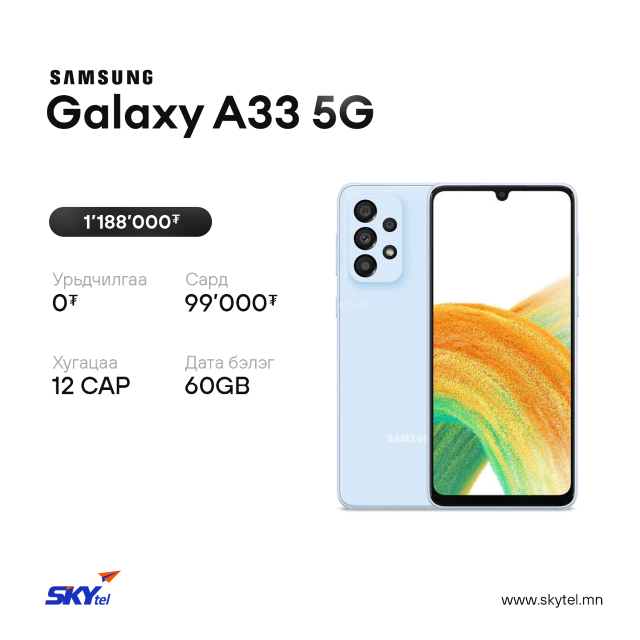СКАЙтелийн хэрэглэгч та дэлхийд тэргүүлэгч SAMSUNG брэндийн 5G дэмждэг Galaxy А серийн гар утаснуудаа урьдчилгаагүй, хүүгүй, лизингийн таатай нөхцөлөөр худалдан аваарай. Таны худалдан авсан гар утас бүрд 100GB хүртэлх дата бэлэгтэй.