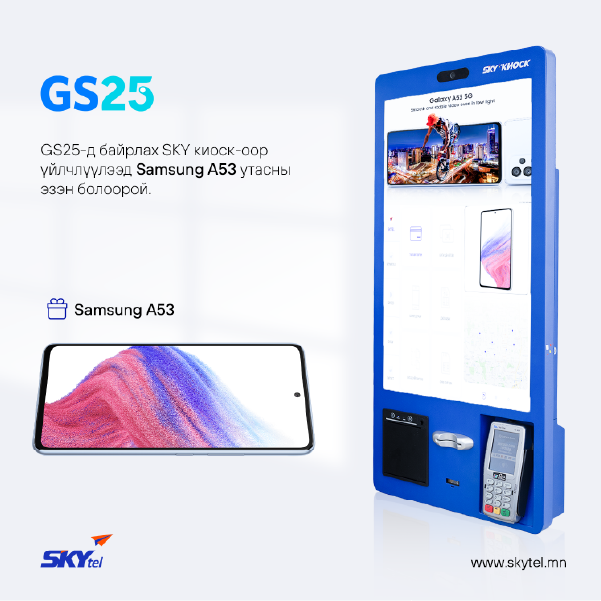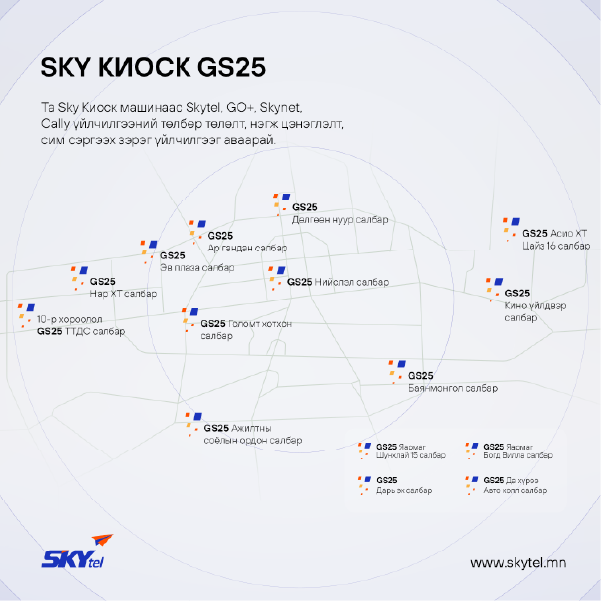 Скайтелийн хэрэглэгч та өөрт ойр байрлах GS25-ийн дараах салбаруудаас SKYKIOSK машин ашиглан шинэ дугаар авах, сим сэргээх, 7000 мянга болон түүнээс дээш үнийн дүнгээр дансаа цэнэглэж, дараа төлбөрт үйлчилгээний 20,000 болон түүнээс дээш үнийн дүнгийн төлбөр төлөлт бүрдээ дараах УРАМШУУЛЛЫН эзэн болоорой.