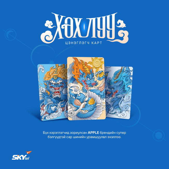 Айлчлан ирж буй модон луу жилийг угтан СКАЙтелийн бүх хэрэглэгчид зориулан “ХҮСЭЛ БИЕЛҮҮЛЭГЧ ХӨХ ЛУУ” сар шинийн урамшуулал зарлаж байна. СКАЙтелийн шинэ болон одоогийн хэрэглэгч бүр 7’000₮, 10’000₮, 14’000₮-ийн картаар цэнэглэлт хийх бүрдээ MacBook Pro, iPhone 15 Pro Max, Apple Watch Ultra зэрэг СУПЕР БЭЛЭГ-ийн эзэн болох болзолт уралдаанд оролцоорой.