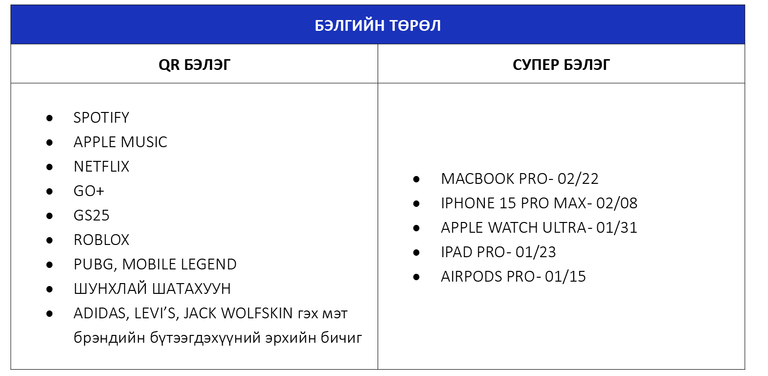 Урьдчилсан төлбөрт үйлчилгээний хэрэглэгч та 7,000₮, 10,000₮, 14,000₮-ийн картуудаар дансаа цэнэглээд дата урамшууллаа авч, MacBook Pro, iPhone 15 Pro Max, Apple Watch Ultra зэрэг СУПЕР БЭЛЭГ-ийн эзэн болоорой.
