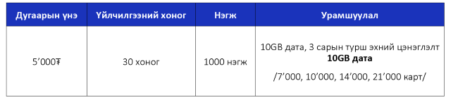 Урьдчилсан төлбөрт үйлчилгээний шинэ хэрэглэгч болон 3 сарын турш цэнэглэгч картаар хийсэн эхний цэнэглэлт бүр 10GB дата бэлэгтэй.