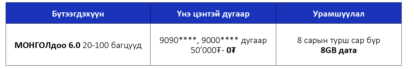 Дараа төлбөрт МОНГОЛдоо 6.0 үйлчилгээний шинэ хэрэглэгч болоод 8 сарын турш сар бүр 8GB дата бэлгэнд аваарай. Мөн 9090****, 9000**** үнэ цэнтэй дугаарлалт 100% үнэгүй боллоо.