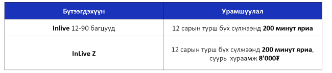 InLive үйлчилгээний багцуудын үндсэн нөхцөл болон бусад дэлгэрэнгүй мэдээллийг энд дарж авна уу.