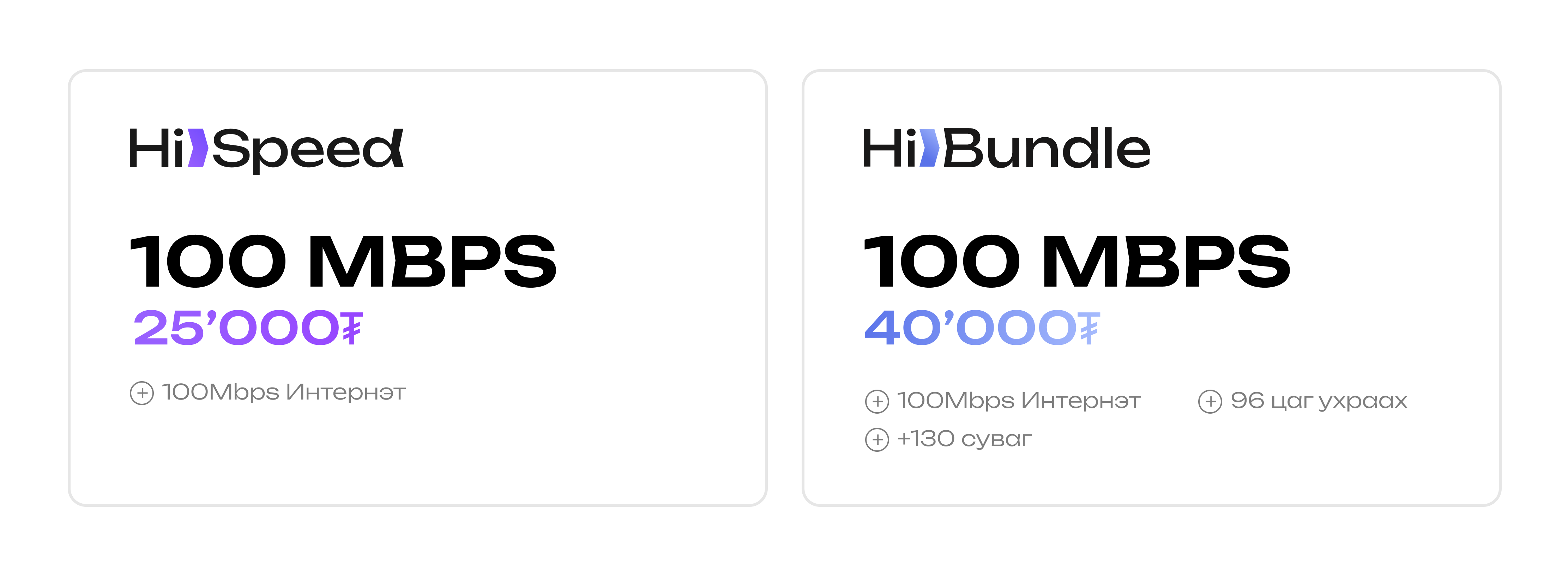 Та HiSpeed буюу дан интернэтийн үйлчилгээнд нэгдсэнээр Хязгааргүй дататай хурдны дээд хязгаар болох 100Мbps хурдыг хүссэнээрээ ашиглах боломжтой.