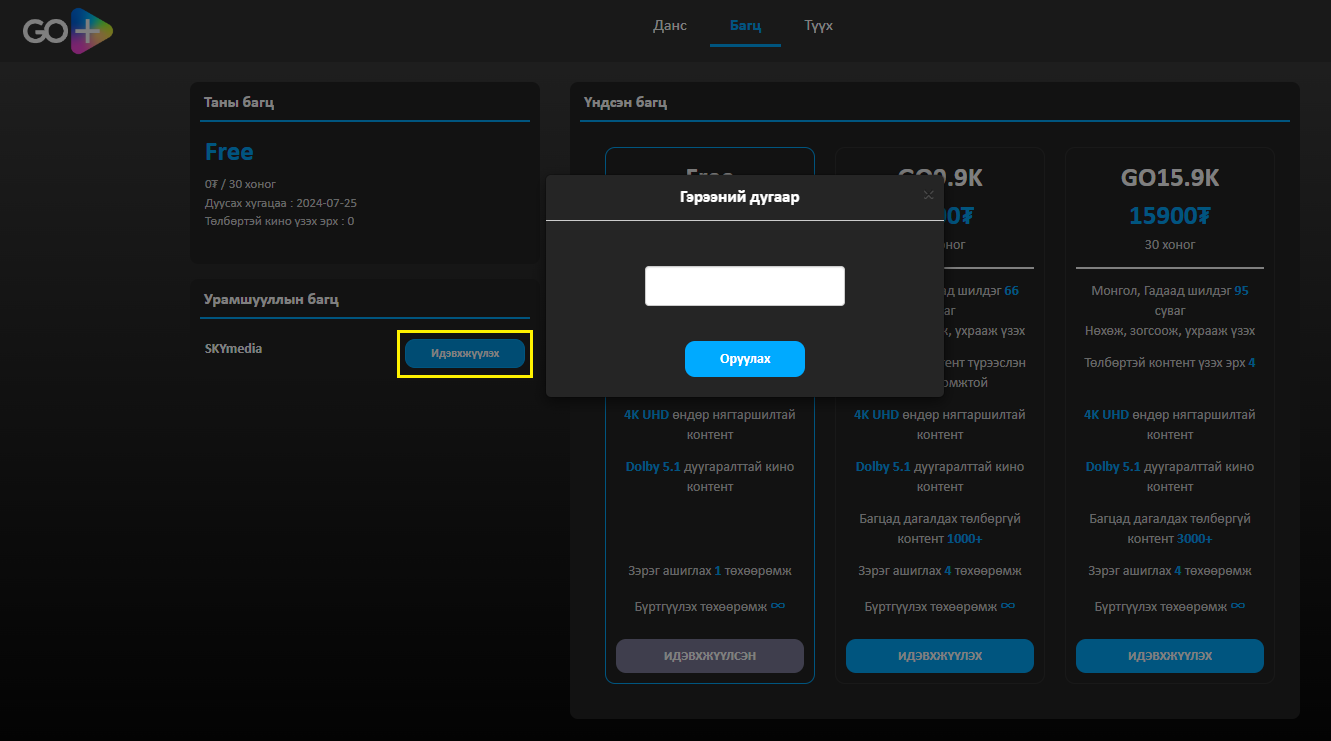 Хэзээ ч, хаанаас ч хүссэн киногоо контент, телевизийн сувгуудаа үзэх боломжтой GO+ үйлчилгээний эрх дагалдана.