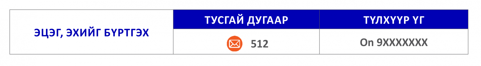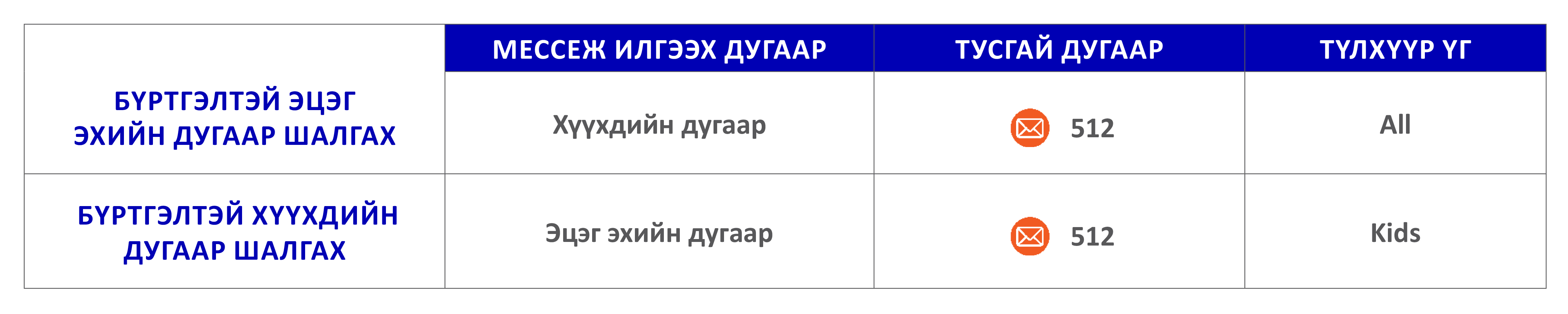 | мессежээр идэвхжүүлэх түлхүүр үг | Тусгай дугаар | |