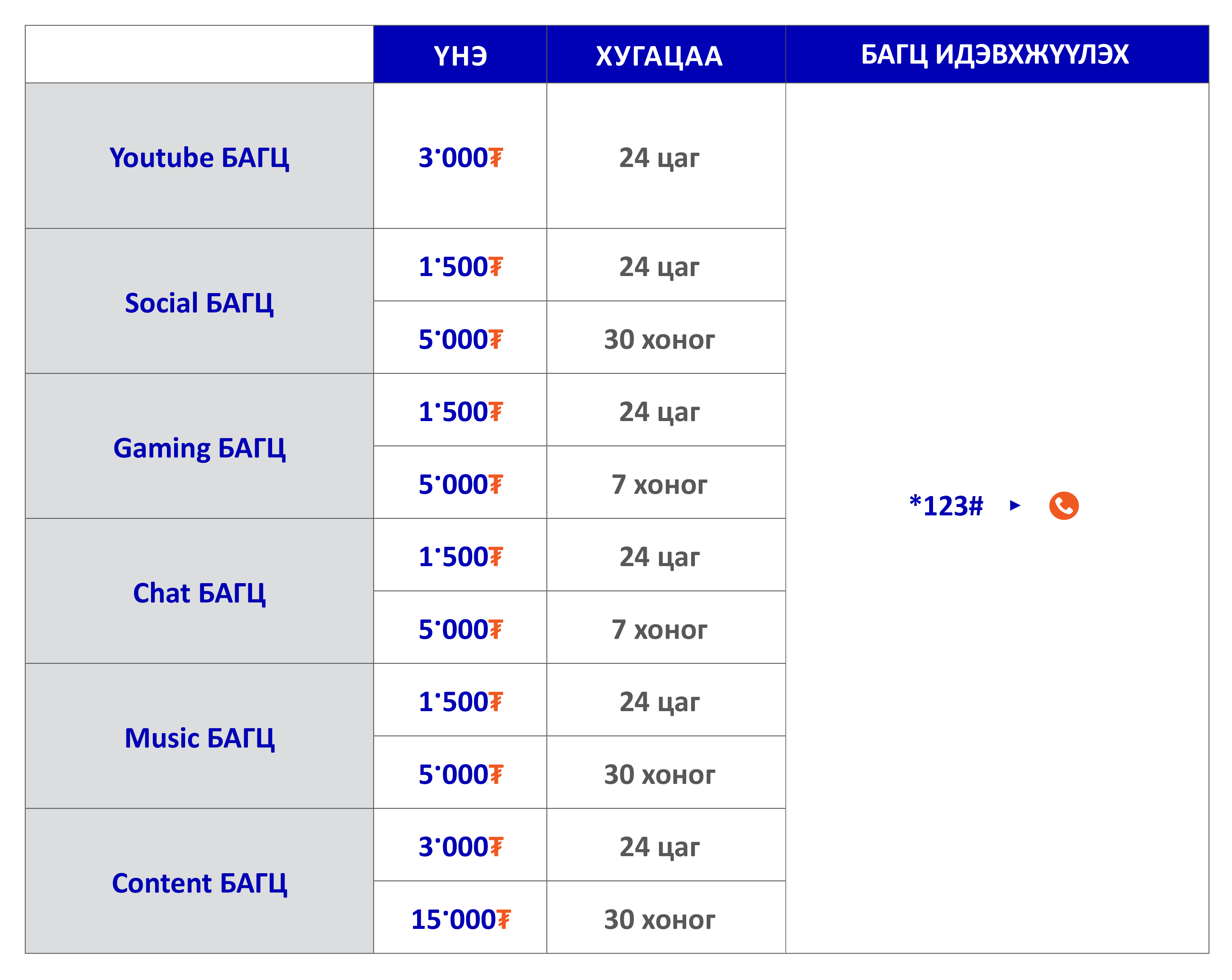 123 дугаар өөрийн сонгосон багцын нэрийг илгээж идэвжхүүлнэ.