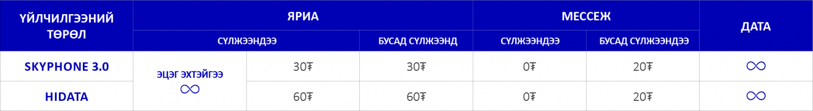 | 7,000₮ | 5000 нэгж | 10GB /20 хоног/ | 5000 нэгж | 10GB /20 хоног/ |
