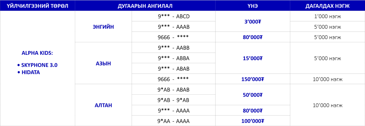 | 5,000₮ | 5’000 нэгж | - | 5’000 нэгж | - |