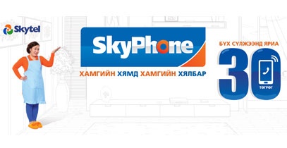 Урьдчилсан төлбөрт Skyphone хамгийн хямд үнийн тарифийг тогтоож, сүлжээ харгалзахгүй 30 төгрөгөөр ярьдаг боллоо.